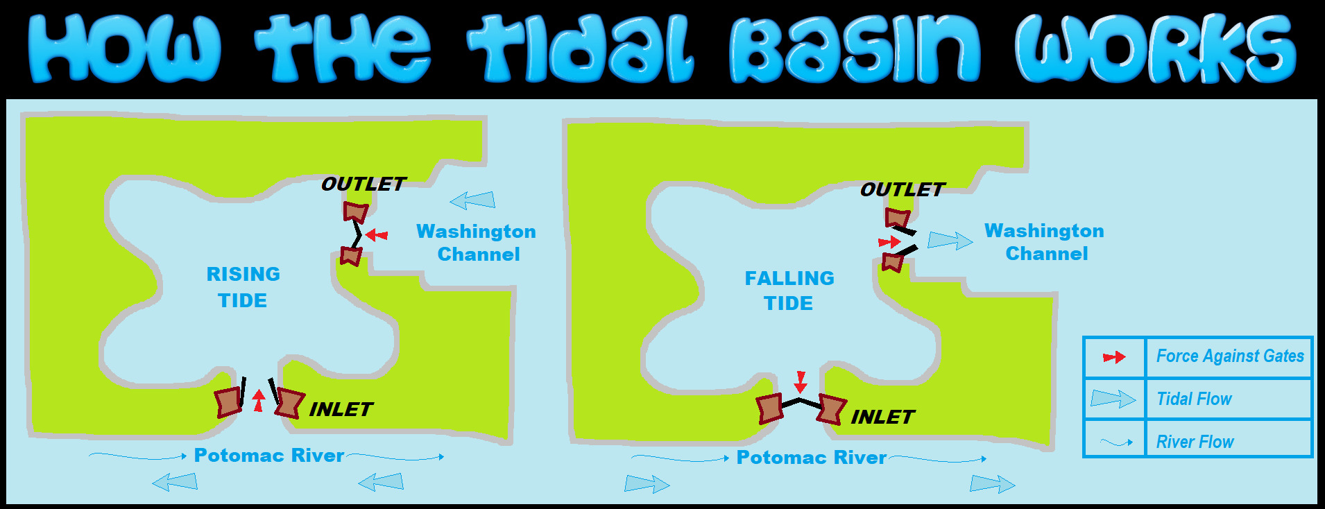 During the flood tide the inlet gates would open to allow water from the Potomac River to enter the Tidal Basin during the rising tide. While the outlet gates close to store incoming water and block the flow of water.