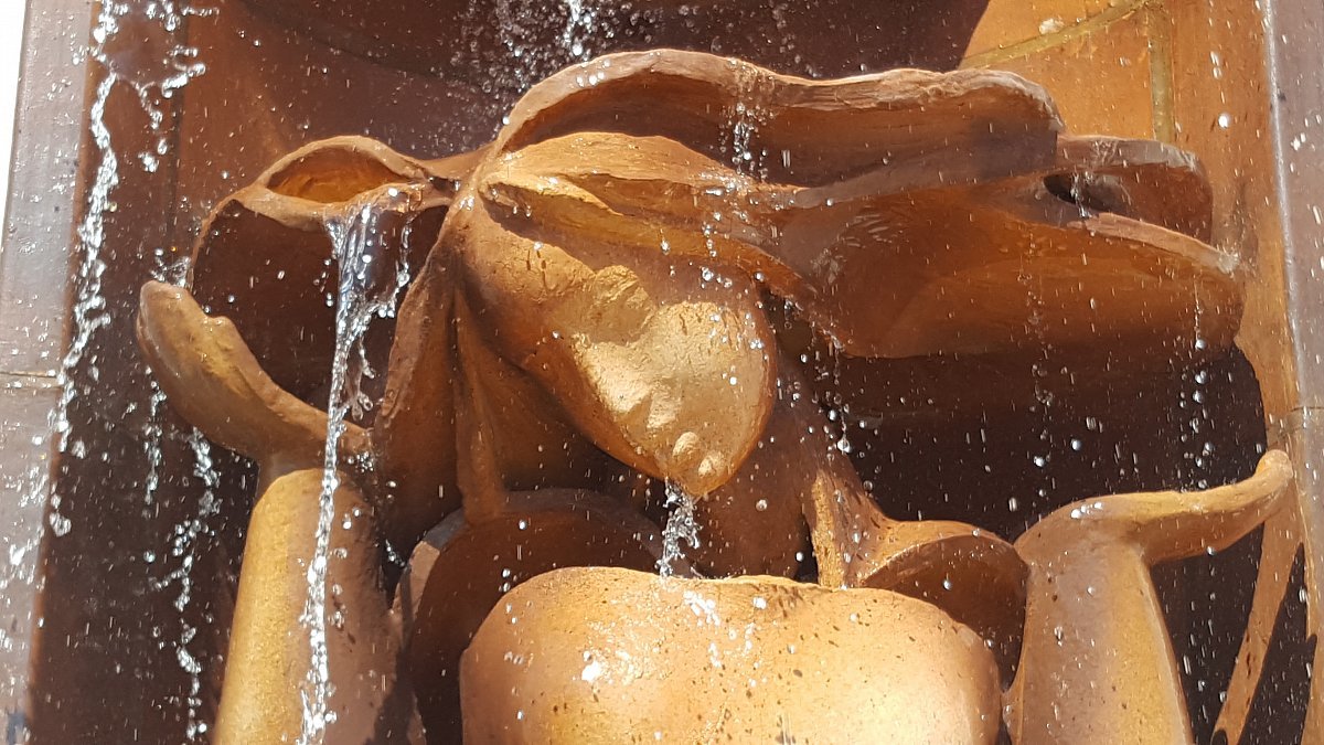 Olga a Miroslav Hudečkovi umějí pracovat s keramikou a mezi lety 1982 - 1984 vytvořili tuto největší kameninovou instalaci ve střední Evropě. Tvorba to byla náročná, panu Hudečkovi šlo dokonce v jednu chvíli i o život (viz rozhovor v odkazu níže). Sousoší je to působivě lyrické a (obzvláště doplněné o vodní záclonu) křehce krásné, zvláště v kontrastu s betonově utilitárním okolím, jehož terén ale velmi organicky doplňuje. Fontána byla dlouhá léta nefunkční, měla být dokonce odstraněna, ale v roce 2019 došlo na její očištění a celkovou opravu. Aktuálně v těsném sousedství probíhá rozsáhlá přestavba nádraží Bubny. Uvidíme, jak s plastikou naloží plánovaná výstavba budovy nové filharmonie.