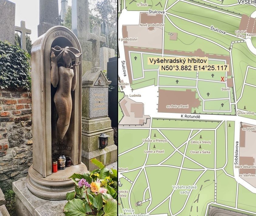 Dodatek 2024: nedávno jsem objevil, že vodní žínka z Vltavské má menší sestřičku! Jmenuje se Marie a potkat ji můžete na Vyšehradě, kde zdobí hrobku rodiny Hudečkových kousek pod schody Slavína. Přesné místo je vyznačené na mapce. Takto krásně se tam vyjímá: