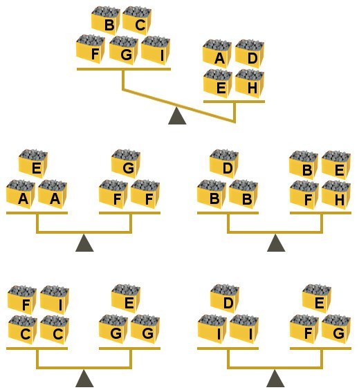 Deine Aufgabe ist es, das Gewicht jedes Kartons (A-I) zu ermitteln. Das Gewicht ist immer eine Ganzzahl von 1 bis 9. Ein Wert kann nur einmal verwendet werden.