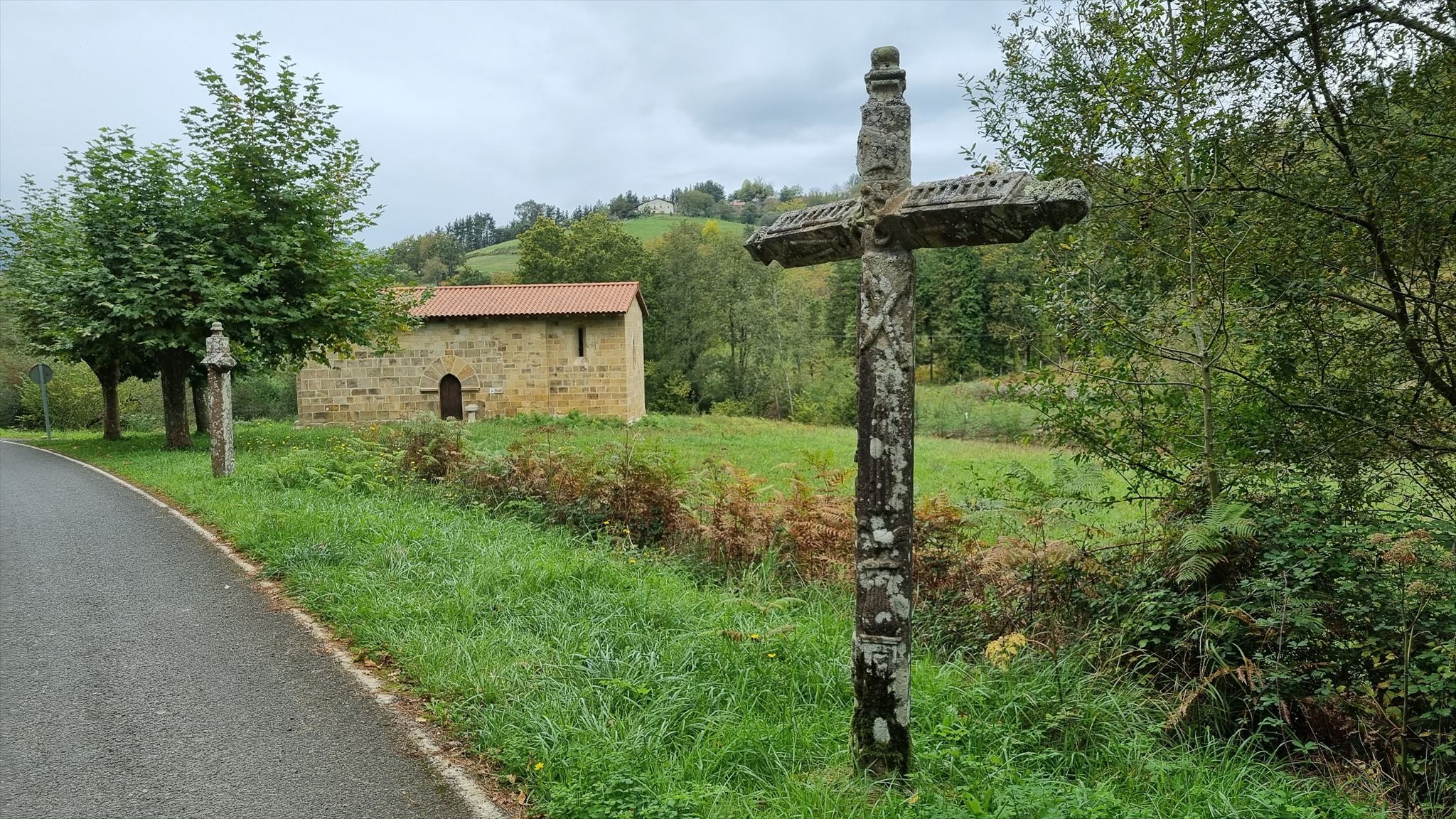 Un viacrucis con grandes cruces de piedra junto a la carretera, une la iglesia de Andra Mari con la ermita de San Pedro y San Pablo.