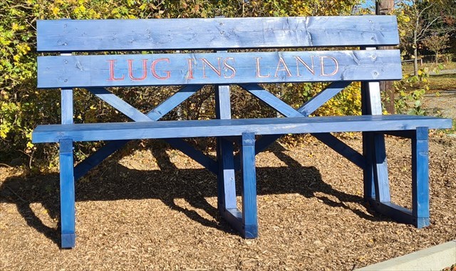 Ihr sucht in der Gemeinde Cremlingen eine blaue XL Bank, auf der steht "Lug ins Land".