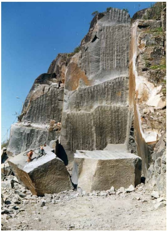 The rock west of Offersøy in Vestbygda and further west Lofoten belongs to the Lofoten rocks and is monzonite and mangerite in slightly different varieties. East of this area is the granitic bedrock (Lødingen granite) with gray and pink granites. The hue of the monzonite in the area by Annfinnslett is dark with a faint greenish tinge, while there are also lighter monzonites with greyish, gray-blue and brownish hue. Most quarries with Klemningen and Perøya as the main quarry have monzonite with a greenish tint.