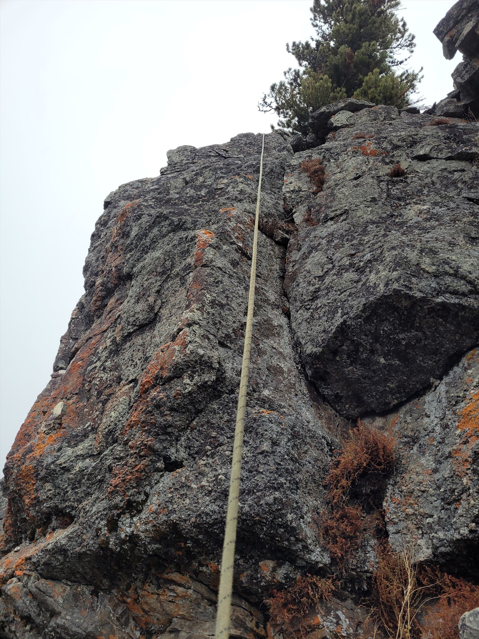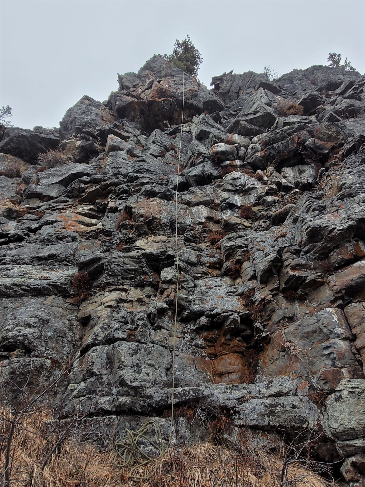 This cliff is yet another area that Greg Cornell explored and climbed on, he called the area The Sands. I think his routes climbed on the left side of this cliff. It's a decent cliff that's interrupted halfway down with a ledge that goes across the entire cliff band. The rappel follows one of the longer and steeper lines straight off a prow next to an excellent tree anchor. It's a decent 20ish m rappel that shouldn't be too complicated. Have fun!