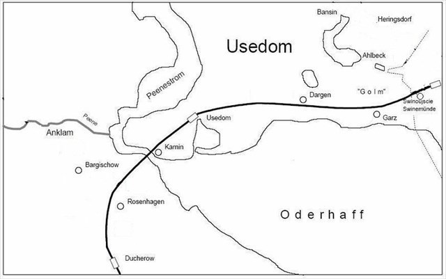 Po wojnie komendantura radziecka kazała odbudować zniszczoną w czasie wojny linię do Karnin, która potem służyła wojskom radzieckim do wywozu dóbr z wyspy Uznam. W roku 1947 rozpoczęto rozbiórkę linii od Karnin do Świnoujścia, pod koniec 1948 pozostały już tylko puste nasypy oraz budynki stacyjne. Również w 1948 roku zaczęto rozbierać odcinek od Ducherow do mostu w Karnin, a w latach 1952-53, zdemontowano częściowo most w Karnin, pozostawiając jedynie część podnoszoną, która istnieje do tej pory.