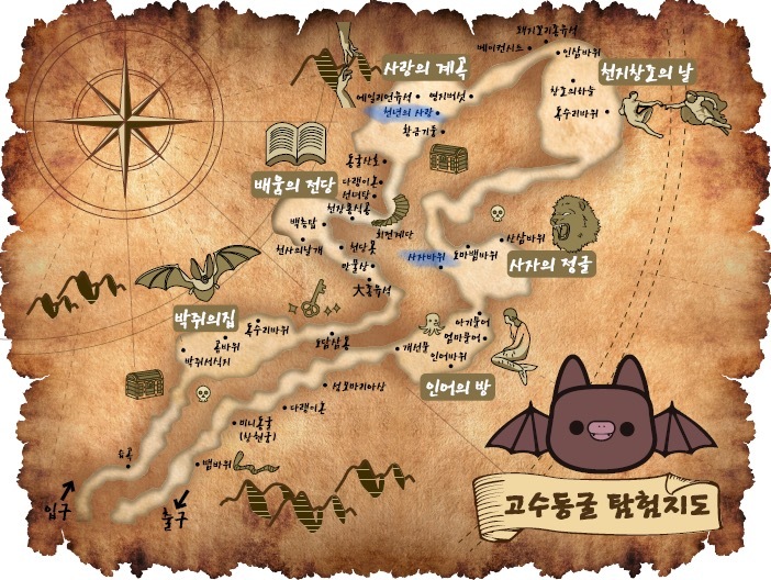- 지도에서 ‘사랑의 계곡’에 위치한 ‘천년의 사랑’은 종유석과 석순으로 구성되어 있다. (진실/오류)