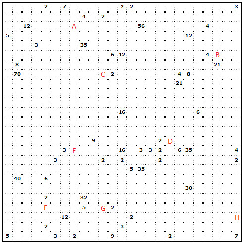 Až budete mít vyluštěno, tak určete, k jakým číslům (tj. k útvarům o jak velké ploše) písmena A - H patří. Pozor, dvoumístná čísla ciferujte. Keš pak najdete na následujících souřadnicích:
