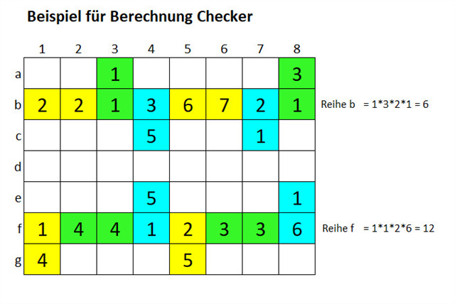 Beispiel) aller vertikalen Steine in Reihe b und das Produkt aller vertikalen Steine in Reihe f. (2 Ziffern , 4 Ziffern)