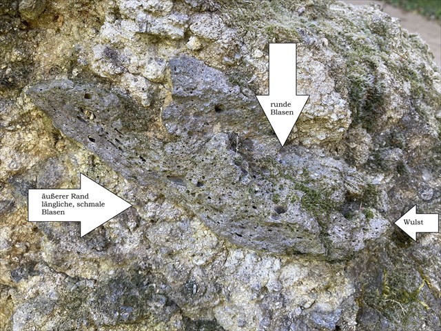 Schaut Euch einmal den kleineren der beiden Suevite (Stein Nr. 18, s. Foto 2) genauer an. An der nördlichen Seite des Steins, oben unterhalb der Spitze, sieht man ein größeres, aufgeschnittenes Flädle. Man erkennt vorn den Wulst, wo das fliegende Glas durch den Luftwiderstand gestaucht wurde und zudem mit einem heute ausgewitterten Gesteinsbrocken kollidiert war. Es hat eine kompakte Mitte und ein etwas in die Länge gezogenes Ende.