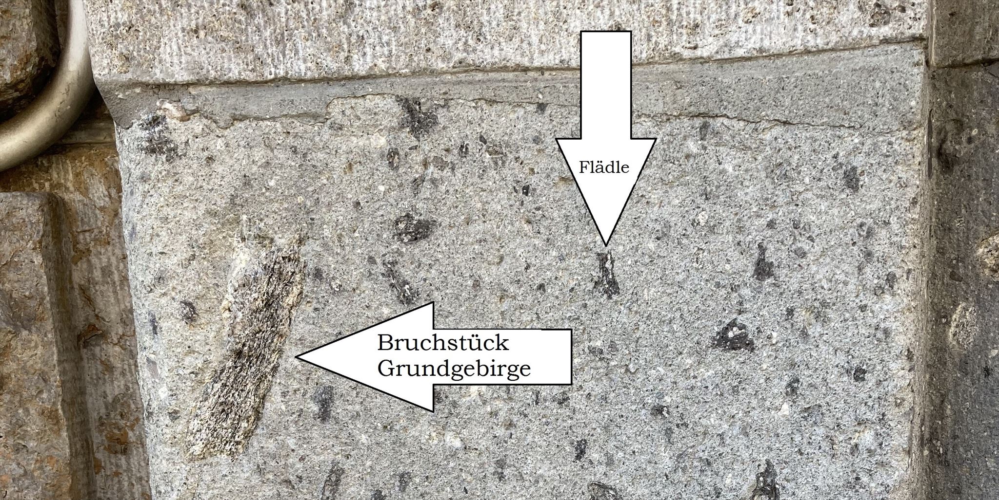 Die Suevitquader und -säulen am Eingang zum Dreisameck zeigen zumeist kleine Flädle. Man sieht hier auch gut Gesteinstrümmer aus dem Deck- und Grundgebirge der Schwäbischen Alb: Sedimentgestein des Deckgebirges und stark zerrüttetes kristallines Gestein des Grundgebirges (Granit, Gneis, Diorit).