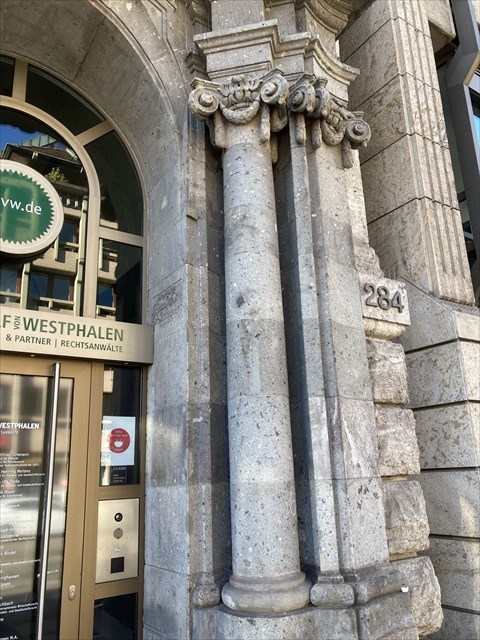B. Eingangsportal, links im Eingang der Quader unter dem Erklärungsschild zur Geschichte des Gebäudes: