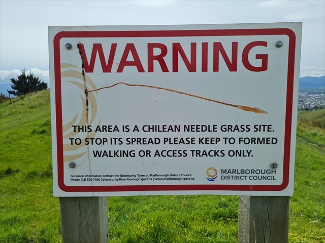 It seems no matter where you go in the Wither Hills Farm Park (WHFP), you will come across these signs warning you to stay on the track in order to prevent the spreading of Chilean Needle Grass. While to me, they provide a handy location to hide a cache, it wasn't until I looked into it further for this cache, that I realised what a nasty pest and biosecurity hazard Chilean Needle Grass is. For more information, copy and paste this link into your web browser: