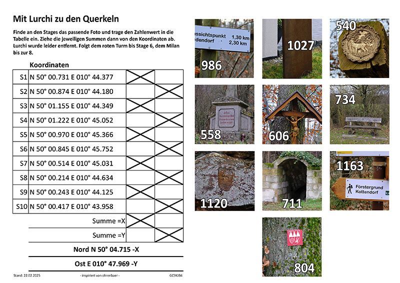 Ordnet an den 10 Stationen auf eurem Weg den jeweiligen Zahlenwert des Fotos in die Tabelle ein und bildet am Ende die Summe. Zieht die jeweilige Summe von den Koordinaten ab, um die Dose zu finden.
