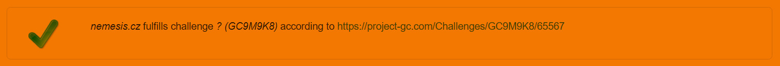 Pro zalogování této keše logem "Found it" musíte splnit následující podmínku: mít zalogováno minimálně 31 D5/T5 keší a to v každém z 31 kalendářních dní měsíce alespoň jednu - na měsíci ani roku nezáleží (započítávají se i archivní keše). Celkem je tedy ke splnění potřeba najít 31 D5/T5 keší. Tato keš se celkového počtu keší potřebných k zalogování této výzvy nezapočítává. K zjištění zdali výzvu splňuješ použij Project-GC challenge checker (ověřovátko) níže.