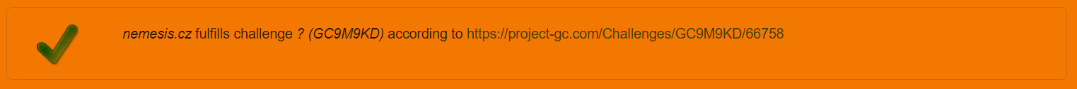 Pro zalogování této keše logem "Found it" musíte splnit následující podmínku: mít zalogován minimálně takový počet D5/T5 keší, abys měl(a) od každého typu 5 různých ikon, 5 různých velikostí a v 5 různých krajích. Dohromady tedy za optimálních podmínek stačí najít 5 D5/T5 keší. Jen pro pořádek: uznávají se tedy následující typy: traditional, multi, mystery, letterbox, wherigo, earthcache, virtual a velikosti: mikro, malá, střední, velká, virtual a jiná (fyzická i nefyzická). Započítávají se i archivní keše. Tato keš se celkového počtu keší potřebných k zalogování této výzvy nezapočítává. K zjištění zdali výzvu splňuješ použij Project-GC challenge checker (ověřovátko) níže.
