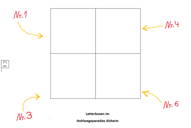 Am Bürgerhaus in Alsheim sind die entsprechenden Wege mit Schautafel und Flyer dargestellt. Die Letterboxen und Boni laufen entlang der offiziellen Wege mit farblicher Markierung. Hier gibts auch immer wieder informative Schautafeln rund um Rheinhessen.