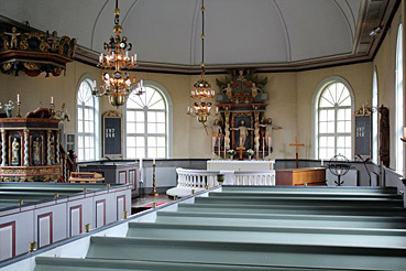 Angerdshestra kyrka har sina anor från 1200-talet och den medeltida kyrkan revs omkring 1660. Den nuvarande byggnaden tillkom 1669 då troligen den fristående klockstapeln också byggdes. Senare har renoveringar och tillbyggnader gjorts, varvid man hittade stockar med runinskrift från 1226! Du ser här en bild från kyrkans insida, hur den ser ut för övrigt kommer att framgå då du lagt pusslet som du finner HÄR.
