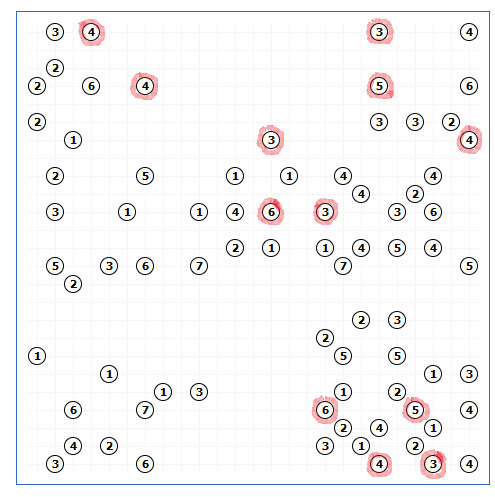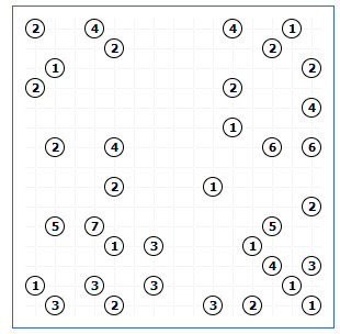 Rébus k vyluštění bude trochu větší a těžší. Podle mě se tento rébus v této velikosti řadí spíš mezi těžší, ale náročnost je subjektivní, takže jsem nechala D3. K vyluštění stačí důsledné dodržování pravidel nahoře, není třeba nikde tipovat ani předvídat (naopak tipování je jedině na škodu). Buďte opravdu pozorní, chyba se udělá strašně snadno. Začněte tím, co je jednoznačné (tj. 7, 8, když máte čtyři směry, 5, 6, když máte tři směry, 3, 4, když máte dva možné směry), tyto první kroky si třeba označte barevně , v nich není moc velká možnost pro chybu, ať v případě chyby nemusíte začínat úplně od znova. Problém tady asi hlavně může být to, že si např. u pětky nebo sedmičky nakreslíte jeden most na všechny strany a pak zapomenete, že v tom místě můžou být i dva (což se mi povedlo i při sestavování příkladu, ale tipla jsem si správně a slovním popisem z toho vybruslila :), takže třeba si tam, kde nevíte, jestli most bude jeden nebo dva nakreslete most přerušovanou čárou....Dejte taky pozor na odlehlejší políčka, většina mostů je sice krátkých ale občas můžou vést i skoro přes celou stranu. I tak ale následující rébus je z té nejlehčí úrovně.