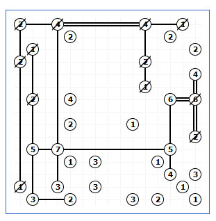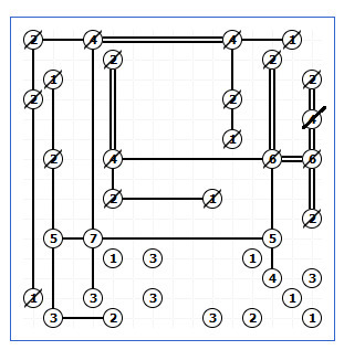 Podívejte se na sedmičku, Jak jsme si už řekli, směrem nahoru ke čtyřce povede jen jeden most. Tím pádem na všech ostatních stranách budou mosty dva. Podívejte se na pětku vlevo, nahoru ke dvojce povede jeden most, k sedmičce dva, dolů tak musí vést také dva.