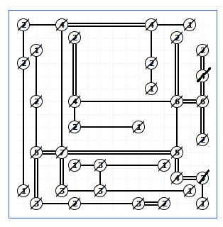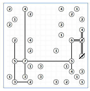 Počet směrů ale není omezen jen touto pozicí na kraji nebo v rohu, aby bylo možné z políčka zakreslit most, musí být ve stejné přímce (vodorovně nebo svisle) v mřížce další políčko, pokud tam takové není, nemůže tím směrem vést most. Takže i uprostřed mřížky jsou z některých políček možné je jeden, dva, nebo tří směry. A počet směrů se vám během luštění dále omezuje tím, že mosty se nesmí křížit.