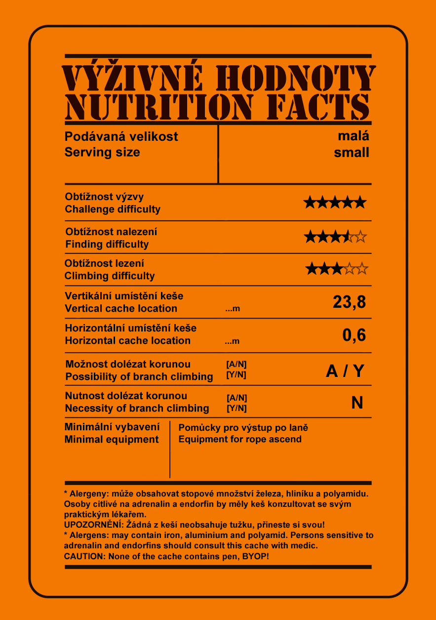 Při lezení pro kešku dodržujte všechna BEZPEČNOSTNÍ PRAVIDLA !!!!! Osvěžit si je v paměti nebo stáhnout a prostudovat si je můžete ZDE nebo ZDE.