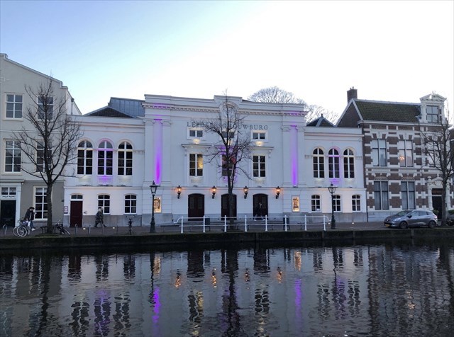 Als je hier op het bankje gaat zitten, dan kijk je uit op de Leidse Schouwburg.