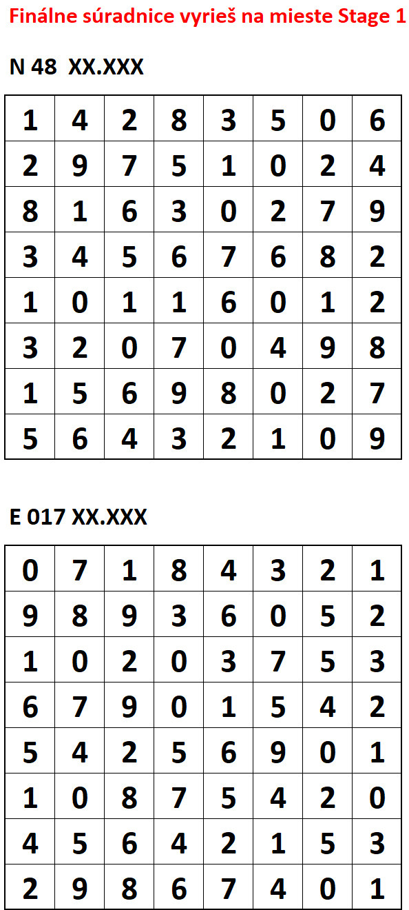 Na mieste prvého stejdžu nájdeš "niečo ukryté" a to "niečo" ti pomôže vyriešiť nasledujúcu úlohu, kde získaš finálne súradnice. Tabuľku si vytlač, ulož do mobilu alebo len prepíš na papier, budeš ju v teréne potrebovať.