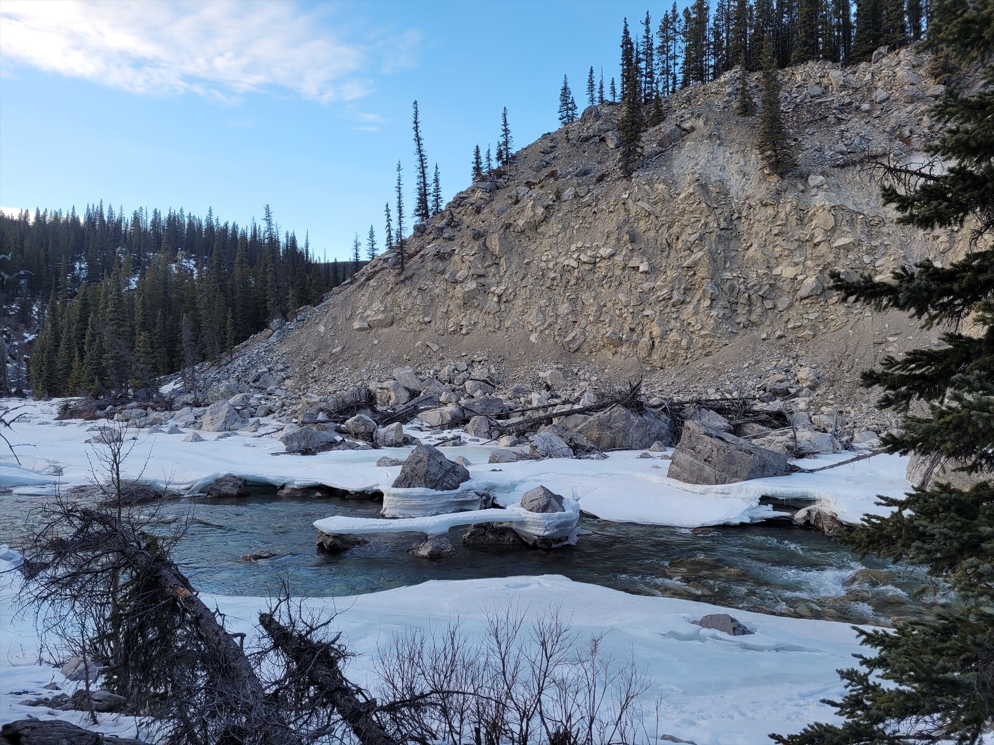 This cache is a small lock and lock container that's located at a great viewpoint perched above the Elbow River. Expect a bit of an adventurous on-trail hike, covering a round trip hike of 4 kilometers and an elevation gain of 100 meters. If you're visiting in the winter, you will be forced to park further back near Elbow Falls which will add about 4 km of easy on-highway hiking.