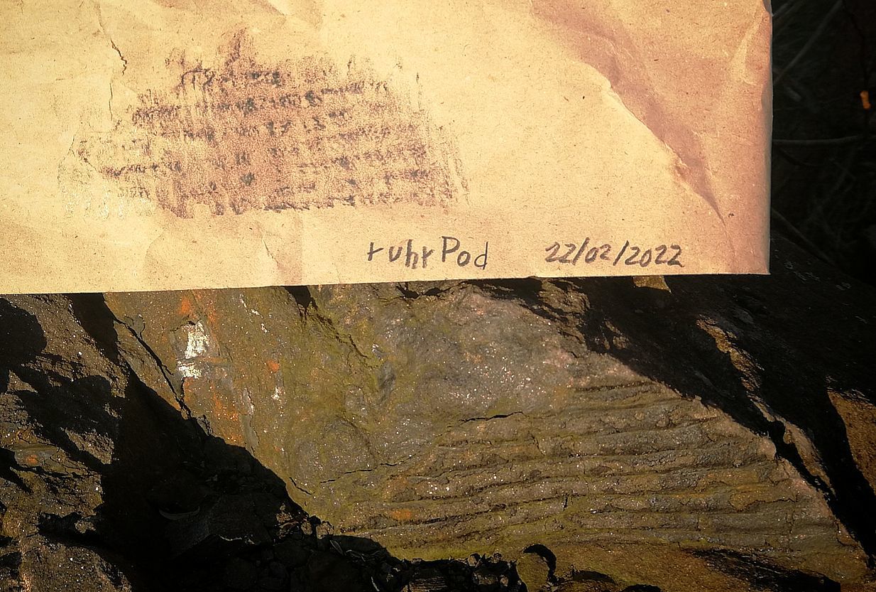 Pause bitte die Versteinerung mit einem Blatt Papier und einem weichem Bleistift oder Wachsmalstift ab (Tipps dazu s.u.) und signiere dein Werk (Name, Datum). Füge bitte ein Foto davon deinem Log bei. Beispielfoto >>