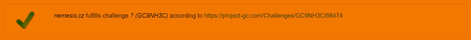 EN: in order to log this cache with "Found It" log you have to: find at least 1 T5 caches with „tree climbing“ or „diffuclt climb“ or „climbing gear required“ attribute during each of Czech national bank holiday, but any cache with "challenge cache" attribute is excluded from checker to prevent "coach potatoes" to log it from home during the holidays. That makes 13 T5 caches in total. Archived caches are included to your total number of finds. This cache does not count to your total number of finds for this challenge. To find out if you are quallifiyng for this cache click the Project-GC challenge checker below.