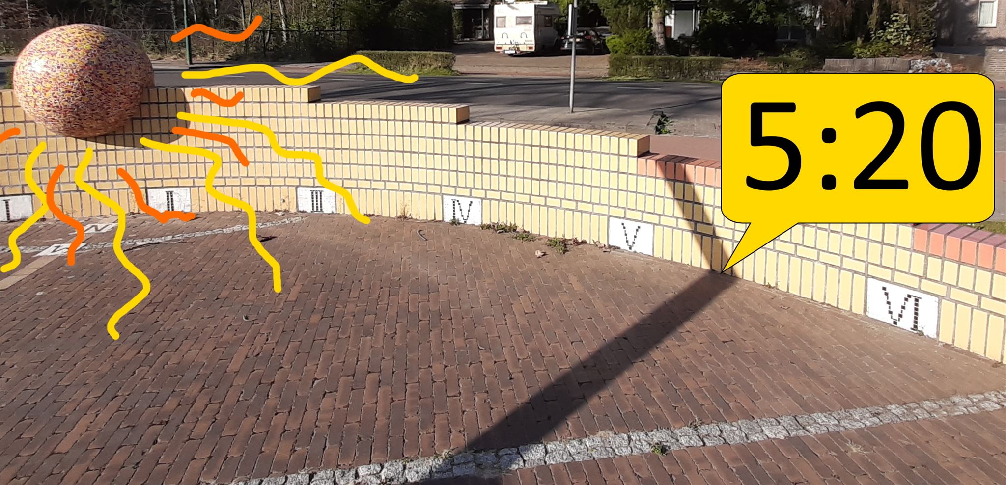 1. Gebruik de zonnewijzer om de tijd van je bezoek te bepalen. Wat is het verschil tussen de met zonnewijzer bepaalde tijd en de 'echte' tijd op dit moment? Kun je dat verklaren? Plaats de afgelezen tijd digitaal in je log, of (beter nog) voeg een foto van de tijd op de zonnewijzer toe aan je log.