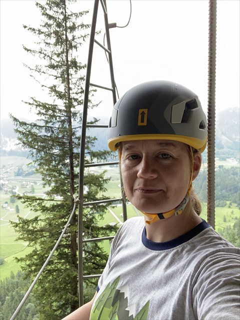 EN During the via ferrata you will pass this unique turning ladder (Drehleiter).