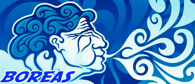 BOREAS was the Greek god of the cold north wind and the bringer of the winter. Boreas is depicted as being very strong, with a violent temper to match. He was frequently shown as a winged old man with shaggy hair and beard, holding a conch shell and wearing a billowing cloak (Wikipedia)
