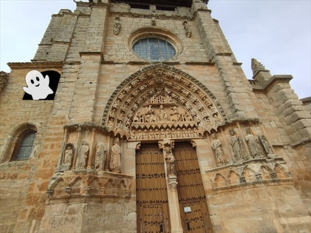 Creo recordar que hace algunos años, yo diría que fué aproximadamente a mediados del siglo XIII, pasé por aquí. Pero había una iglesia mucho más pequeña... ¡Esta de ahora es enorme! Yo diría que la que tenemos ante nuestros ojos es la tercera iglesia más grande de la provincia de Burgos y que se construyó entre los siglos XII y XVII. Esto último lo sé porque tiene elementos románicos (portada occidental y nave de la epístola), pero su estilo predominante es el gótico (crucero, cabecera con cinco capillas poligonales, portada sur). En el siglo XV se construyó el claustro, considerado obra de Juan de Colonia, destacando sus capiteles. Hacia 1504 se añadieron la nave sur y la portada de San Miguel. ¡Uy! ¡Qué curioso! Parece ser que fue sede episcopal en la época altomedieval y que luego pasó a depender de la sede episcopal de Burgos por lo que durante un tiempo los obispos de Burgos se llamaron obispos de Burgos y Sasamón. También sirvió de acuartelamiento a las tropas Napoleónicas y, en el año 1812 (en plena Guerra de la Independencia), fue saqueada e incendiada...