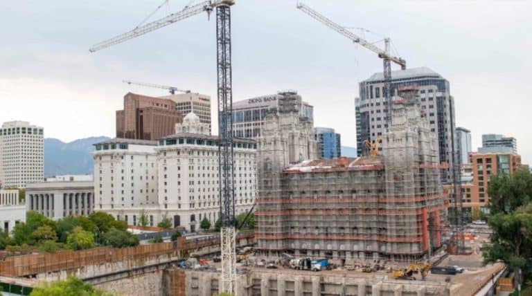 As 2022 began, the Salt Lake Temple renovation project began its third year. Over the past two years, two tower cranes were erected on the north and south sides of the temple. These cranes have been used for various purposes, such as removing stones from the walls and towers. These stones will be cleaned and repaired, and then replaced in their original locations. The cranes have also been used to lift materials for workers into and around the temple. An additional crane with greater lifting capacity was used to lift the new roof trusses.