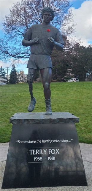 2) With your "found it" log, post a photo of yourself or a personal item (such as a GPS) at the Terry Fox statue. Please do not post photos that show the answers to questions #1 or #3!