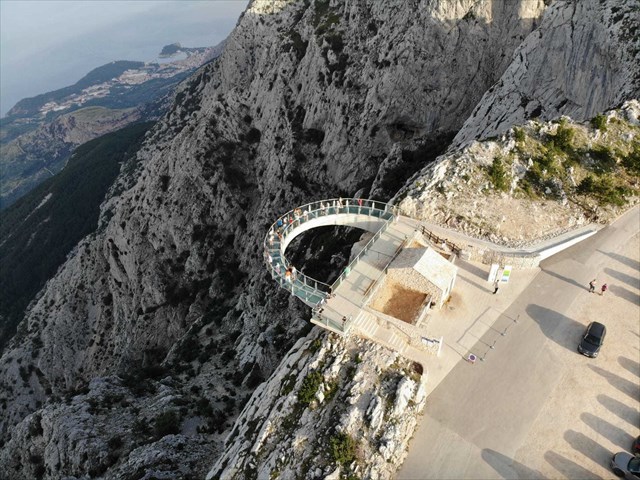Skywalk Biokovo is located at the Ravna Vlaška area, at an elevation of 1228 metres, right next to the info center at the 13th kilometr on the Biokovo road. At the viewpoint, there is also a geological column providing a 3D overview of the cross-section of the rock that forms Mt. Biokovo, from this formation until today, with a geological time chart and description of the types of rock and their ages. The viewpoint area is also equipped with parking and restroom facilities. The Skywalk is reached from the Biokovo road that starts at the entrance into Biokovo Nature Park, about 6 km east of Makarska, and leads to the highest peak, Sv. Jure (St. George) at an elevation of 1762 metres, making it Croatia's highest paved road. The viewpoint plateau is 23 x 3 metres in size, offering a stunning view over the sea and islands. On sunny, windy days, it is possible to see all the way to Italy. A walk along the clear glass skywalk, over the edge of the cliff, provides a bird's eye view of the Mt. Biokovo rocks edge of the cliffs. Due to the unfavourable geomechanical properties of the soil, the proximity to fault lines and earthquake zones, and the strong winds that blow here, a pre-stressed concrete construction was designed for the main support system, upon which the steel and glass structure sits. The floor of the Skywalk is made entirely of glass.