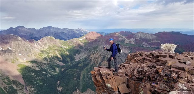 The summit of Pyramid is a special location! Be sure to soak in the tremendous views of the Maroon Bells across the valley, other high peaks of the Elks, and mountains beyond. All of the Elks 14ers and a number of 14ers in other ranges can be seen from this summit. The ruggedness and various colors of the geology are truly fascinating. And as a bonus, you can log the summit benchmark too.
