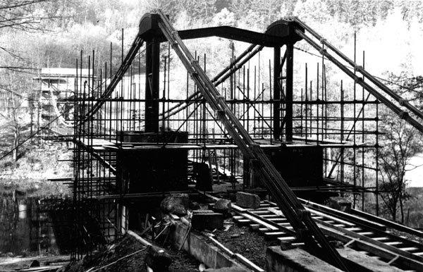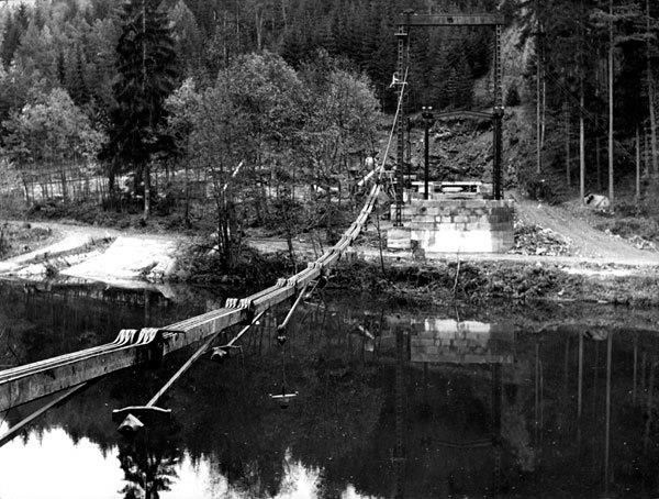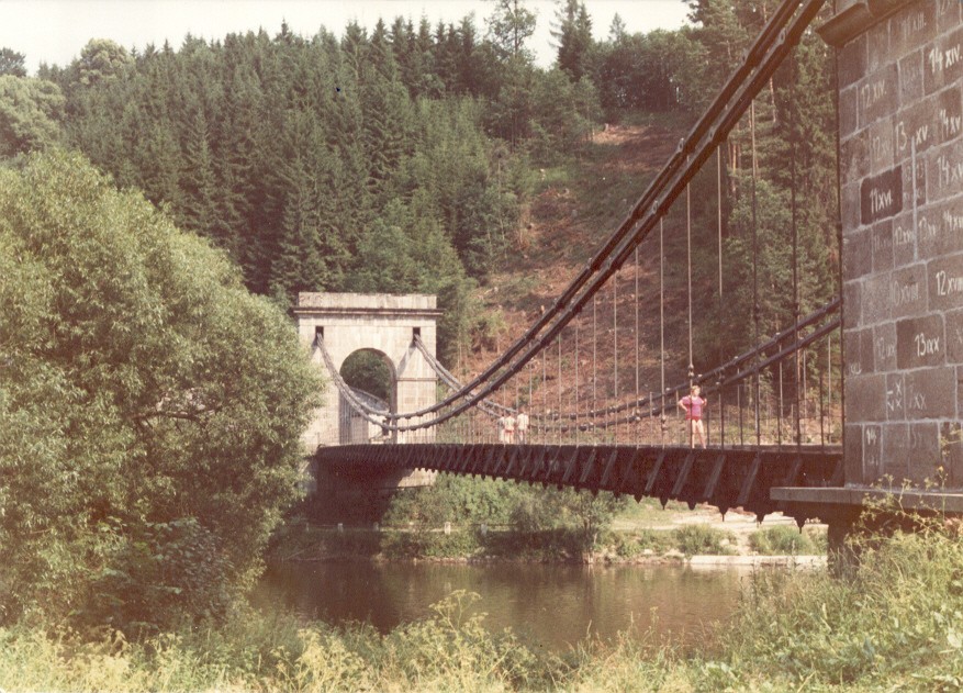 The bridge, designed by engineers Gassner and Friedrich Schnirch, was built by Vojtěch Lanna between 1847–1848 over the Vltava in Podolsko. It replaced the old ferry that at that time could not handle the growing traffic between Bavaria and Galicia. The bridge served for many years until 1960 when it was decided to take it down. The reason being that there was already a 510 meters long reinforced concrete bridge from 1942 towering above it and also the Orlík dam was being filled and that would flood the bridge, at that time already a cultural monument. The bridge was dismantled, documented and stored at Markův mlýn.