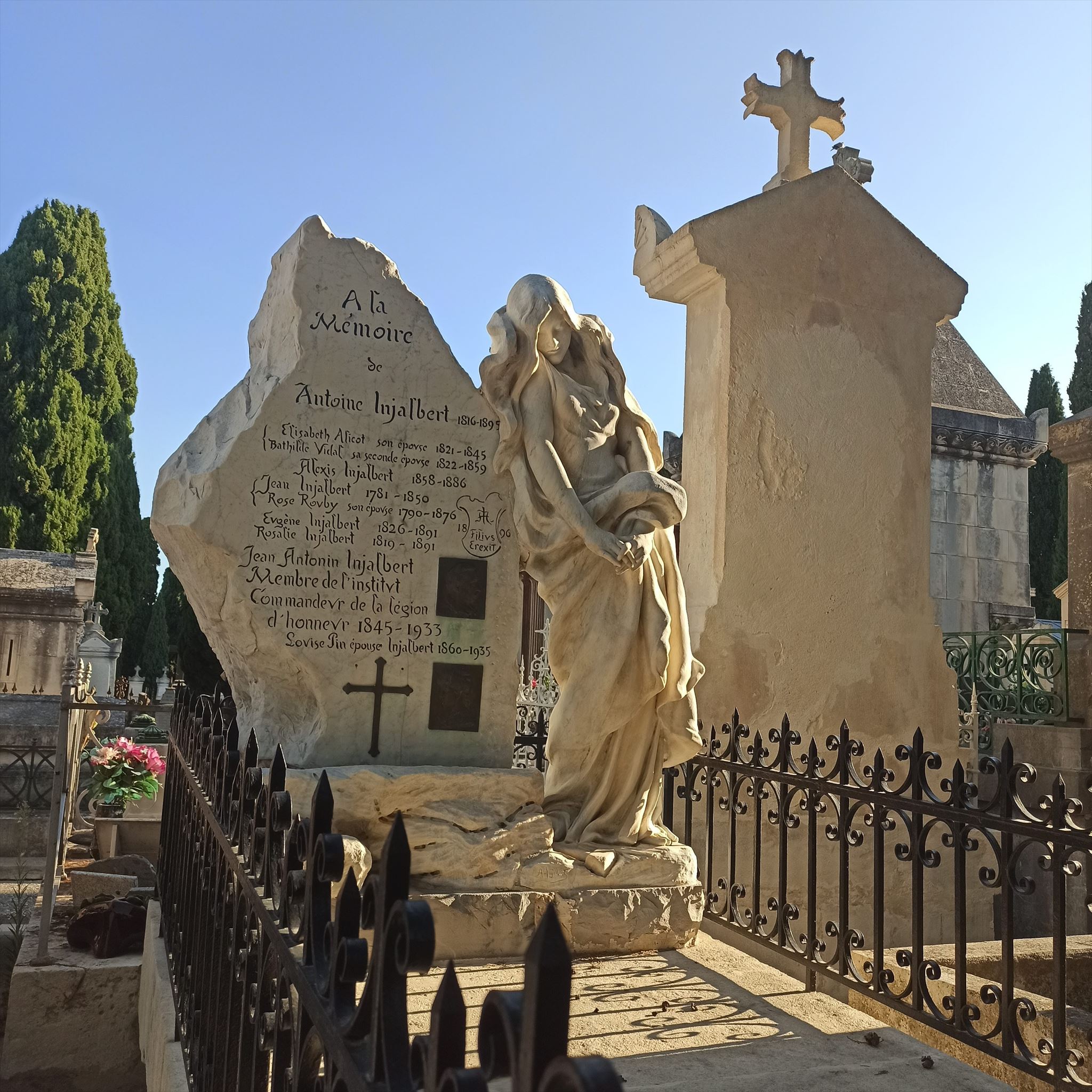 Ce tombeau a été sculpté par Jean-Antoine Injalbert en mémoire de son père, Antoine. Jean-Antoine Injalbert, né à Béziers en 1845 est un sculpteur important de la fin du XIXe siècle, on lui doit notamment à Paris les 4 bronzes du Pont Mirabeau ainsi que le tympan du Petit Palais et à Béziers la fontaine du Titan du plateau des poètes ou les sculptures de la Villa Antonine.