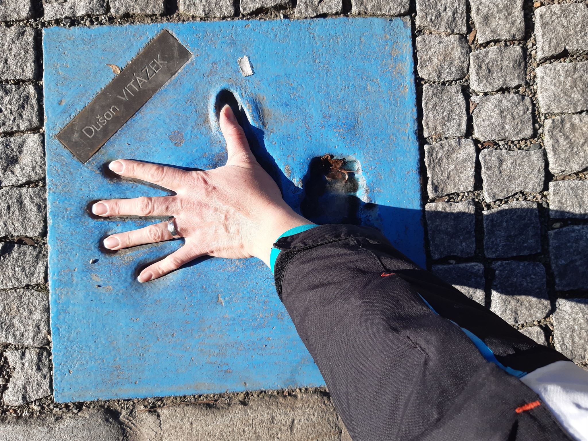 Úkol číslo 1: najděte kachličku, kterou zdobí otisk dlaně herečky Radky Coufalové (má žlutou barvu). Nás budou zajímat jména na kachličce vlevo (modrá s červeným srdíčkem) a vpravo (červená). Vezmete písmenka v tomto pořadí: