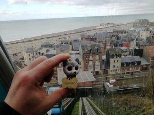 - Prendre une photo de vous ou d'un objet personnel de la cabine avec la gare basse et Le Tréport en arrière plan (Voir exemple ci-dessous). Montrer son visage est optionnel pour garantir la confidentialité de chacun.