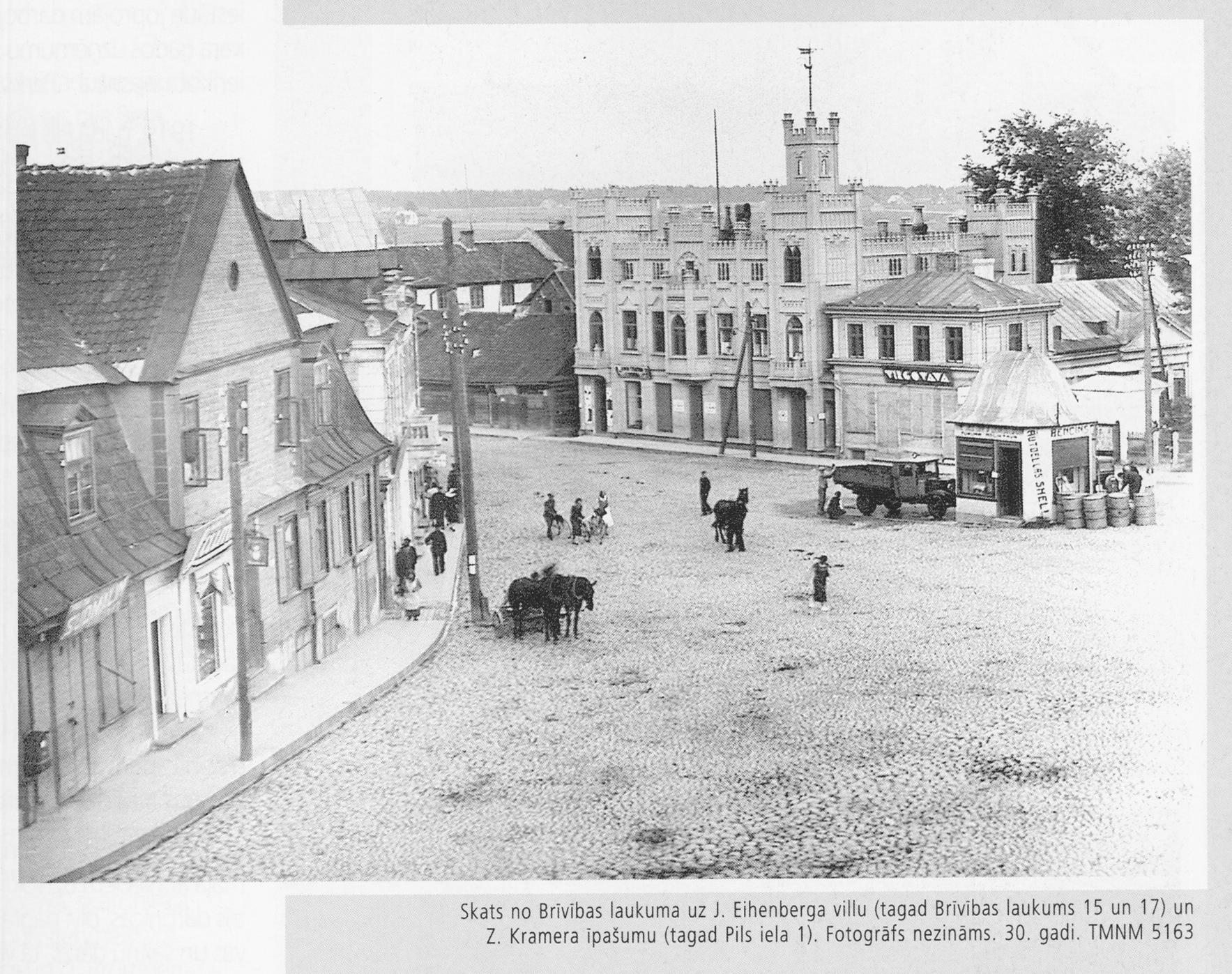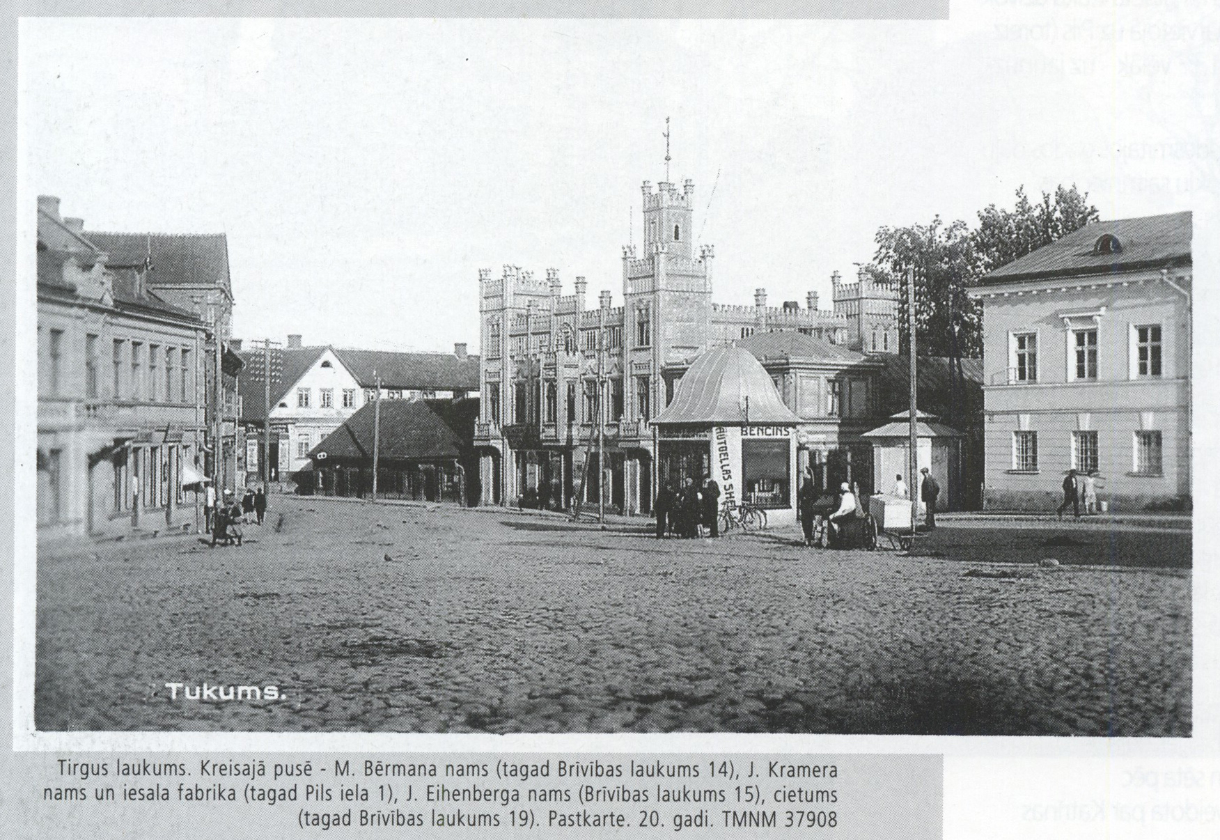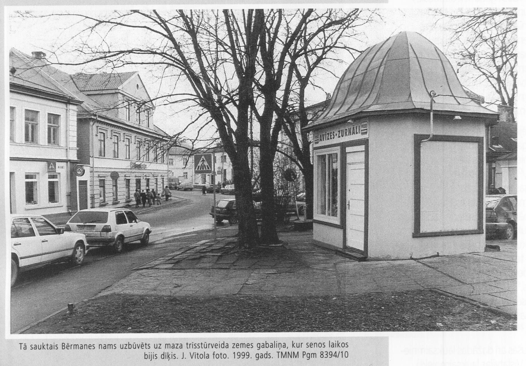 At the end of the 18th century there was the duke's fishpond. In the city plan of 1802, the plot of the land had not been built yet, but in 1892 this land was owned by Liba Bermane. It is one of the smallest plots in Tukums. In the 1930s, the plot was home to “Shell Company of Latvia Ltd., London Ltd.”, a fuel warehouse and filling station. There is no exact information when the gas station stopped operating, it could be after WWII, because in the 60s there was already a candy and ice cream kiosk. Now it belongs to the municipality and is rented by a travel agency.