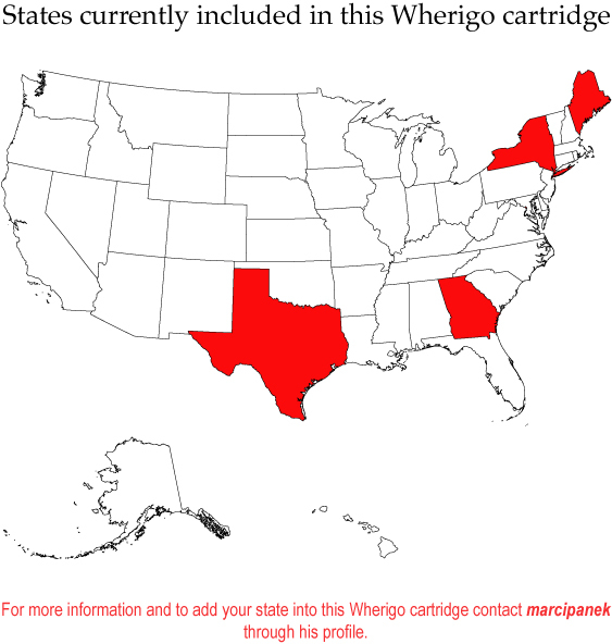 This Wherigo is part of a project created by marcipanek. The idea is to have geocaches scattered all over the USA that could be found using this single Wherigo cartridge. Below is the map and list of states currently included in this Wherigo cartridge.