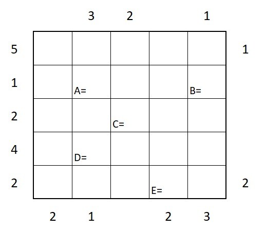 V každé řadě a v každém sloupci jsou umístěny vždy jeden dům s jedním, dvěma, třemi, čtyřmi a pěti podlažími.