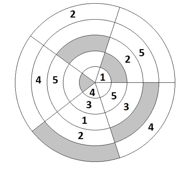5 tak, aby se čísla v každé pětině, ale též v každém kruhu, vyskytla pouze jednou.
