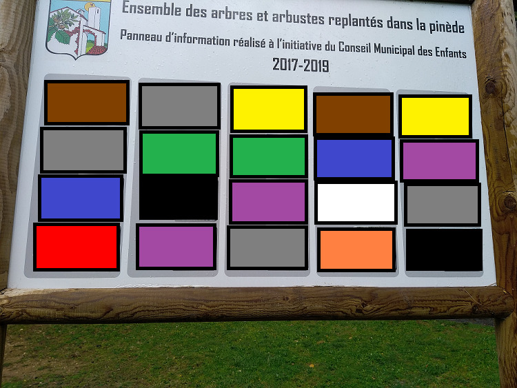 Vous vous trouvez face au panneau "Ensemble des arbres et arbustes replantés dans la pinède". C'est grâce à celui-ci que vous parviendrez à trouver la valeur des lettres qui vous permettront de reconstituer les coordonnées finales de la forme :