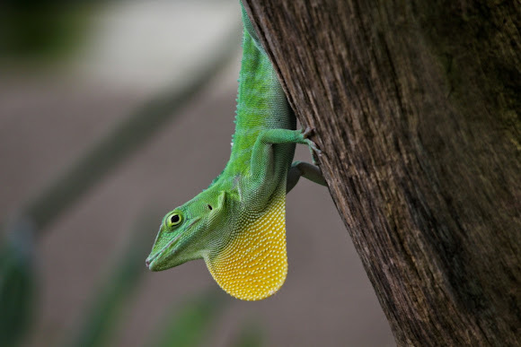 5.5 to 10.5 inches long. This species has a large head and short, tiny spines along the back. The coloring is leaf green, but Jamaican Giant Anoles turn dark brown at night. The dewlap of males is lemon yellow with an orange center; it is smaller and dusky beige on females.