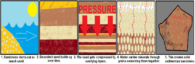 Sedimentary rocks are formed by the consolidation of sediment particles. These particles are eroded from other rock types from higher elevations that gradually migrated towards the ocean over time. This stone was formed by Lithification, a process where the compaction of individual grains of sand that experienced immense pressure that cement together into a solid stone. Sandstone is usually comprised of particles of quartz or feldspar, clay, or calcite. Different types of sandstone can vary in hardness, but these rocks tend to be softer than other rock types such as granite.