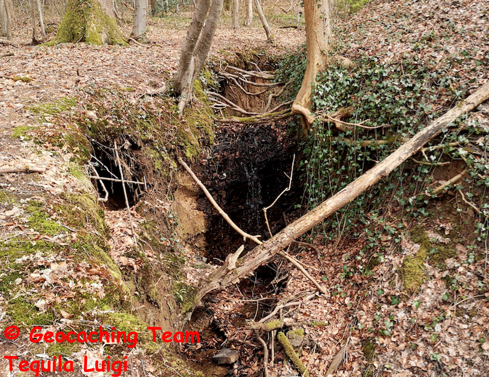 Unter diesem Erklärungsblock befindet sich ein Bild. Dieses Bild zeigt die vor Ort Geologie. Der obere Teil des Bildes zeigt den größten hier findbaren Wasserfall (von den angegebenen Koordinaten aus links) und im unteren Teil den Austritt der Quelle (von den Koordinaten aus unten im Bachbett).